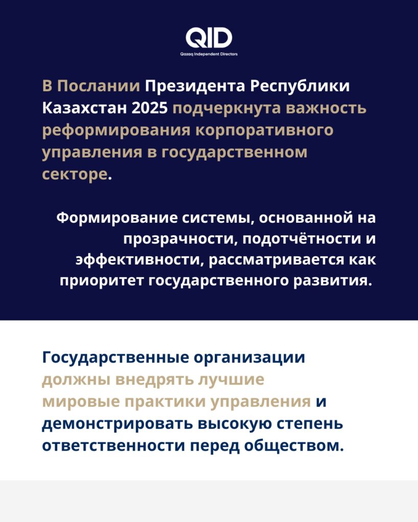 Президентінін Жолдауында мемлекеттік сектордаты корпоративтік баскаруды реформалау кажеттілігі атап етілді. Басымдык – ашыктыкка, есеп берушілікке жене тиімділікке негізделген баскару жуйесін калыптастыру.